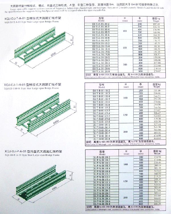 大跨距橋架 大跨距匯線橋架可分為梯級式、托盤式、 槽式。 梯級式匯線橋架具有良好的通風性能,不防塵、不妨干擾。它適用于敷設計算機電纜 、通信電纜、熱電偶電纜及其它靈敏系統(tǒng)的控制電纜等,它對控制電纜的屏蔽干擾和重腐蝕環(huán)境中電纜的防護都有非常好的效果。