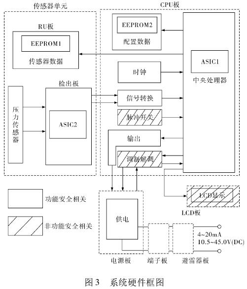 按硬件塊劃分,硬件部分由功能安全相關的硬件塊和非功能安全相關的硬件塊組成。其中,功能安全相關的硬件塊包括傳感器、傳感器數據、供電、信號轉換、時鐘、配置數據、輸出和中央處理器;非功能安全相關的硬件塊包括脈沖開關、調制解調和LCD液晶顯示。
