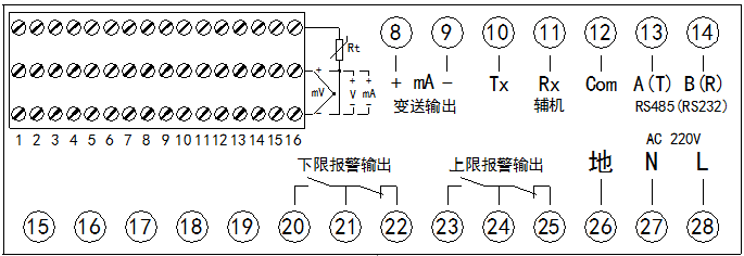 報警輸出:(1)1-64通道統(tǒng)一上下限報警,繼電器輸出觸點容量 AC220V/3A