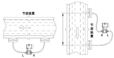 對不能用導壓管引出的介質,可用雙法蘭差壓變送器進行流量測量,其裝置見下圖,測量水平管道時,兩法蘭同在一水平面上,不存在液位差,不考慮遷移,測量垂直管道是,始終承受(r-r0)H的液位壓差故儀表應有(r-r0)H正遷移量。